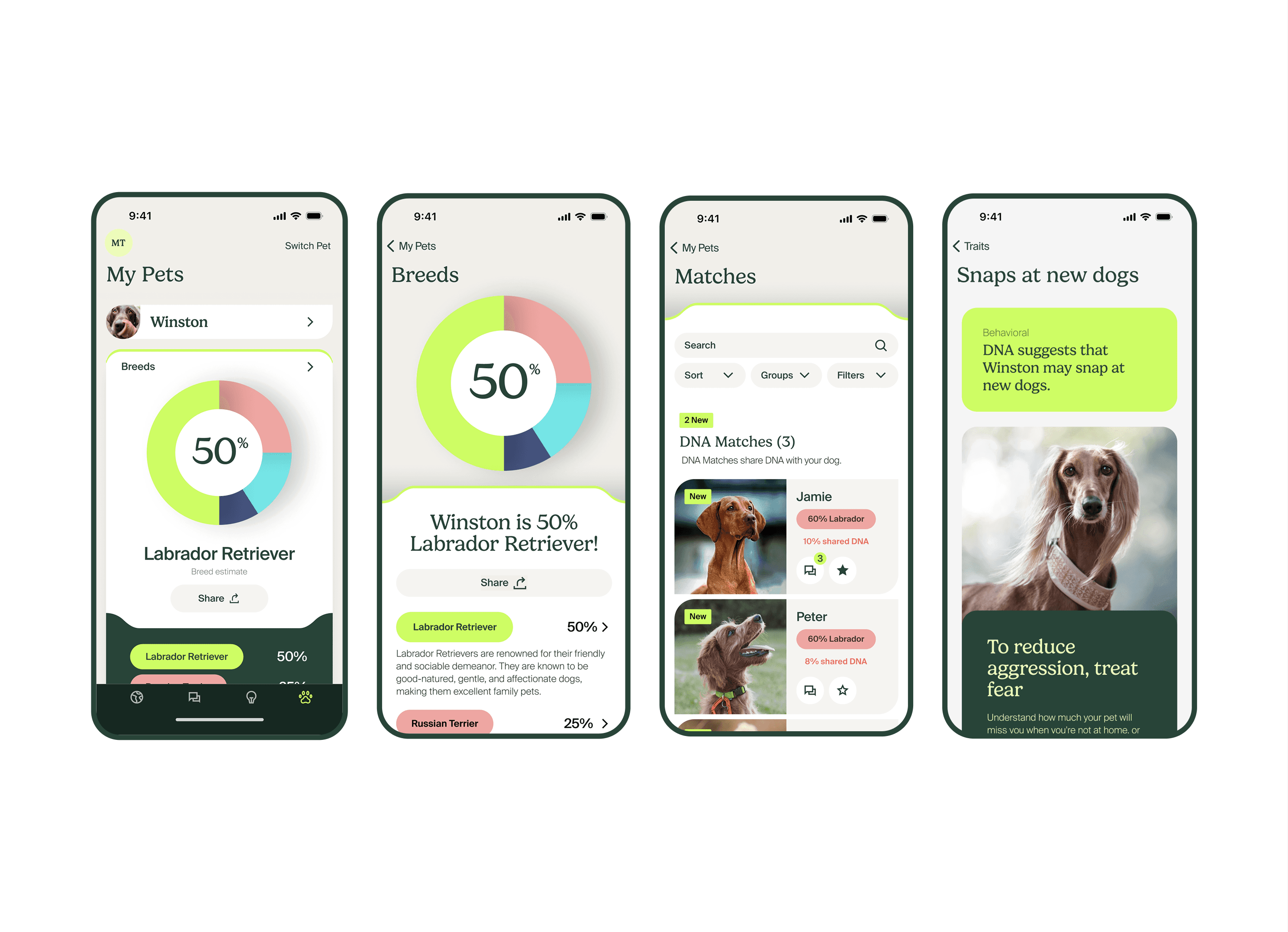 The scope was end to end: a marketing site, product pages, checkout flow, and sign up flow to bring people in — and then the actual product itself. That included a pet dashboard, breed breakdown, personality traits reveal, and one of my favorite features: DNA genetic matches connecting your pet with other pets nearby who share the same lineage.
